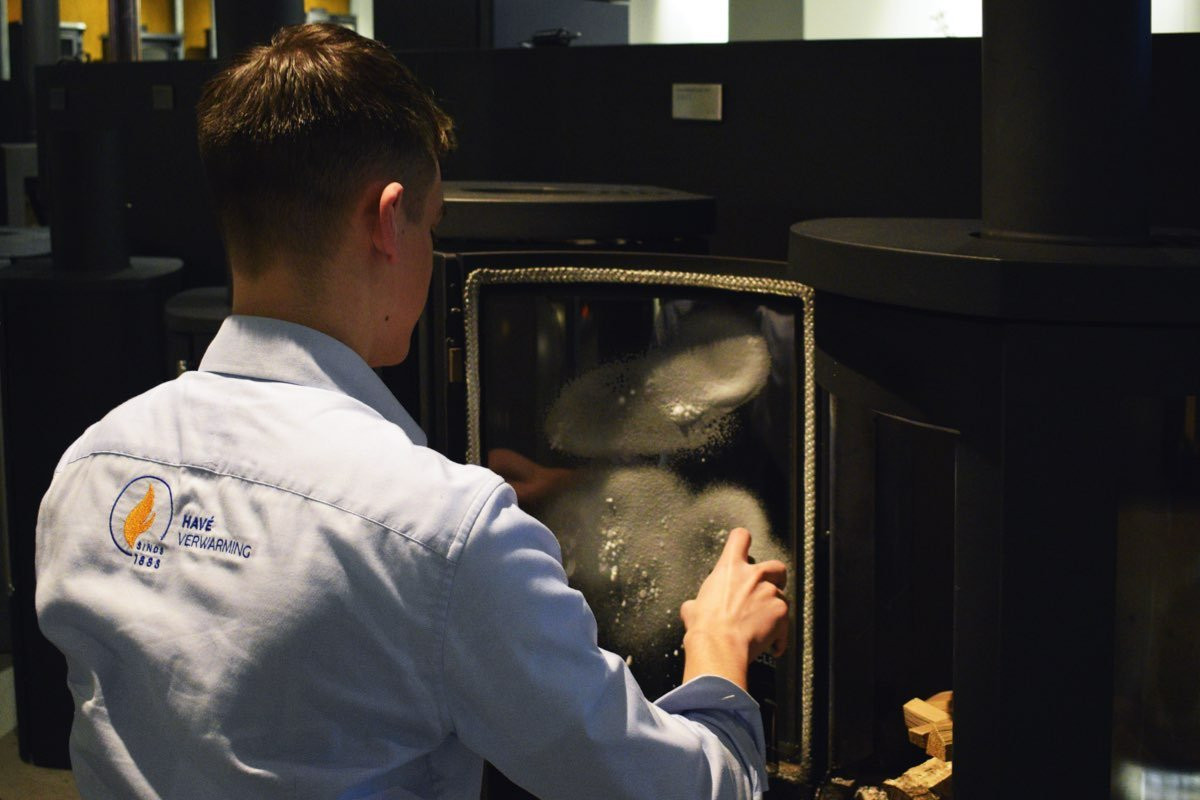 Maak gebruik van een speciale kachelruitenreiniger (HAVÉ Multicleaner)
